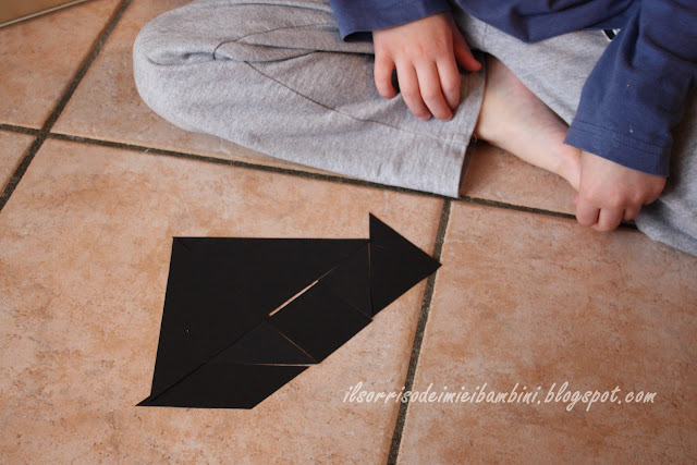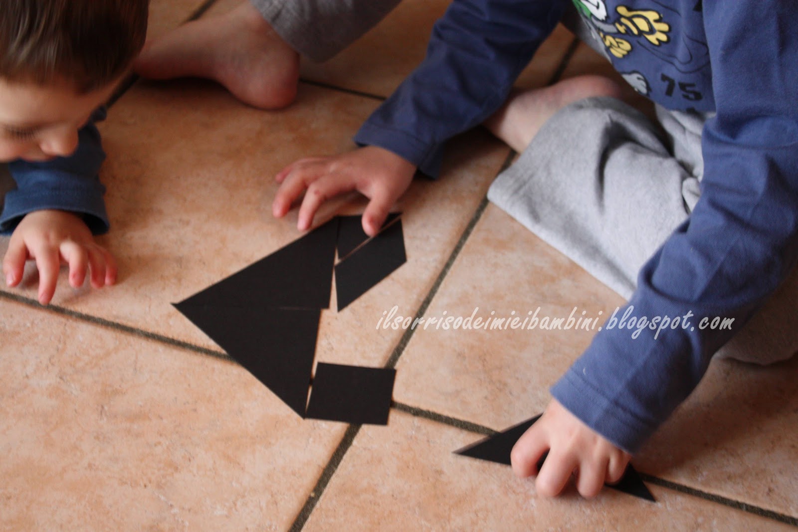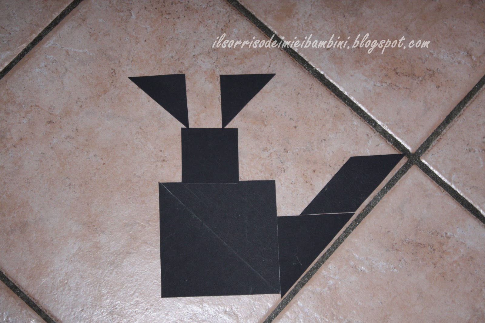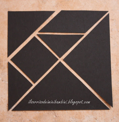 Lo scopo del gioco è quello di utilizzare tutti i Tan senza sovrapporli e ricreare forme che richiamano figure stilizzate di persone, animali, oggetti, o semplicemente secondo la propria fantasia ma di senso compiuto. Si può acquistare, ma è facilissimo realizzarlo da sé, in legno o in cartoncino. Noi abbiamo utilizzato un cartoncino nero, per meglio far risaltare le figure, ricavando un quadrato di 15 cm di lato e tagliando i sette pezzi secondo questo schema :